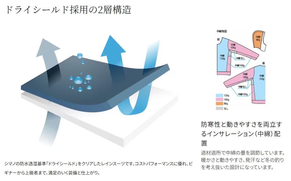 シマノの防水透湿基準「ドライシールド」をクリアした、メンテナンスしやすい化繊インサレーションレインスーツ。ライフジャケットを着用した際のポケットの位置や釣りの動きにあわせた中綿の配置など、釣り場で考えぬいて形にしたコストパフォーマンスに優れるレインスーツです。