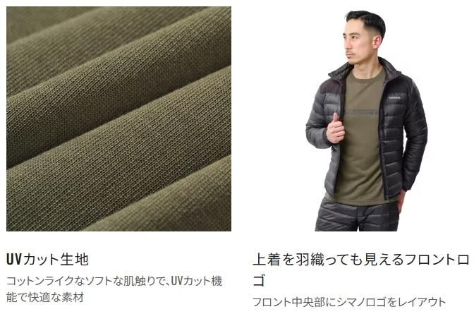 冬はインナーとして、秋や春は一枚で行動することなども想定した生地の厚み。UVカットの機能をもち、快適な着心地でアングラーをサポート。定番のシマノロゴデザイン。