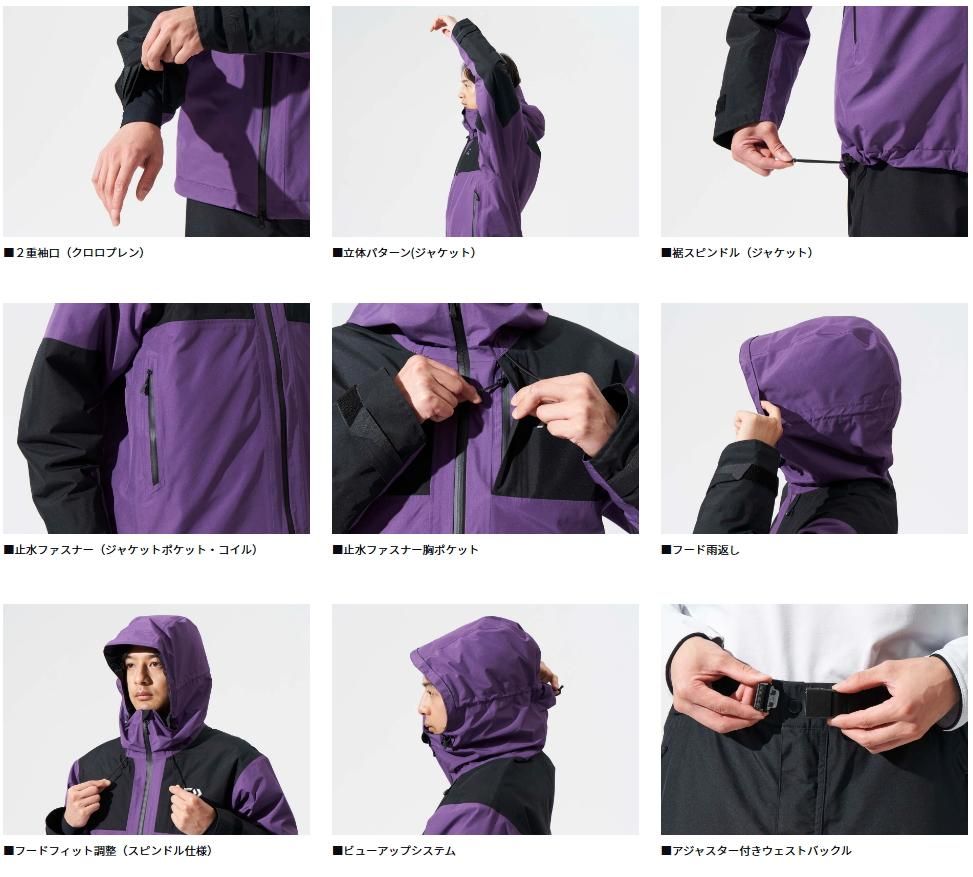 袖口からの浸水を軽減するカフスを内袖に搭載し、衣服内の濡れを最小限に抑える。パンツはバックル付き調整ベルトが搭載され、ずり下がりにくい仕様。