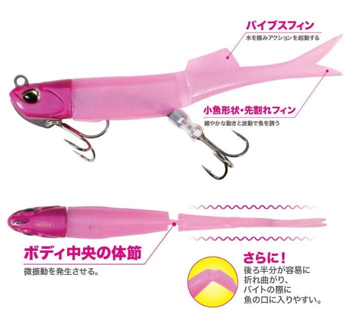 薄い体節でボディを区切るだけでなく、 背中のバイブスフィンで水を受けることにより、後ろ半分が細かく高速微振動(バイブレーション)してヒラメを誘う。