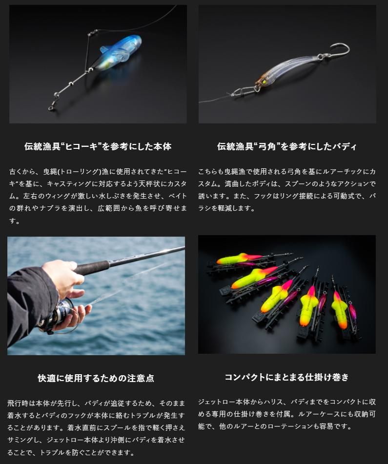 天秤形状をしたジェットロー本体が“飛ばし”とスプラッシュによる“寄せ”を担い、その後方を追うように泳ぐシラスサイズのバディ(喰わせルアー)にバイトさせるという仕組み。小型ルアーに足りない飛距離だけでなく、アピール力も補うことができます。