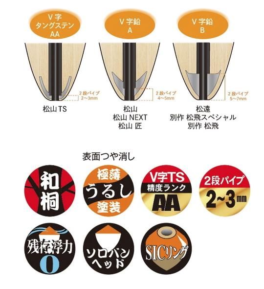今までのV字形状鉛をタングステン素材に変更し、さらなる低支点ウエイト形状を新たに設計しました。馴染んだ際のシモリ玉の位置が従来の松山よりさらに下部に配置されることでウキ感度が高まり、これまで以上に海面下の状況を伝えるウキとなりました。