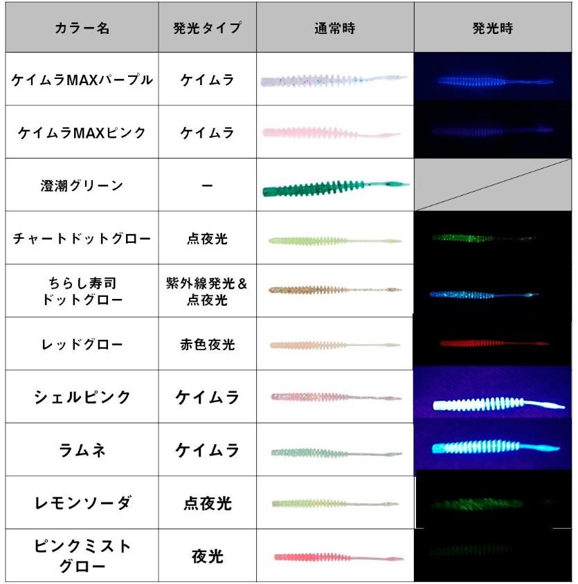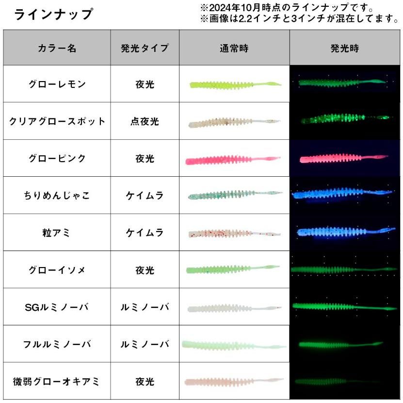 一般的に使用される素材「塩ビ」を採用することで揺れる船上でもジグヘッドにセットしやすい。さらにサイズは、現行のアジングビーム2インチと3.5インチの中間的なサイズである3インチ。アジのサイズの大きい南紀エリアだけでなく全国的に使える「丁度良いサイズ感」に仕上げた。