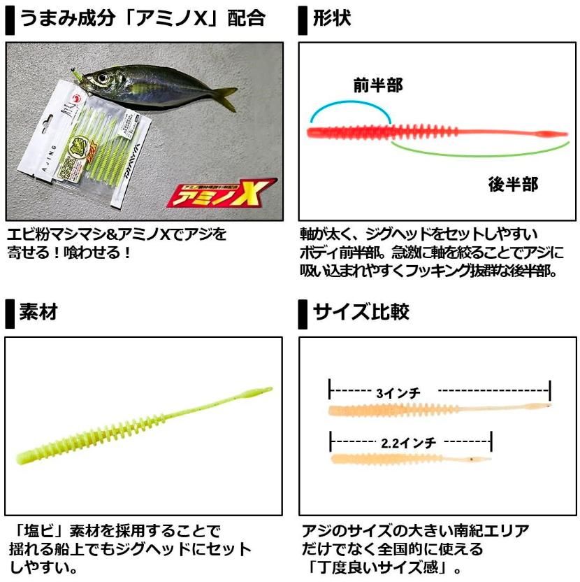 バチコンアジングはその名の通りバーチカルに仕掛けを投入し、アジの回遊を待つ釣りであることから、回遊してきたアジをいかにその場に留まらせるか、効率的に口を使わせるかが鍵となる。一般的なアジングと違ってワームのアクションで食わせるというよりアジの回遊ルートにワームを漂わせて「待つ」要素の強い釣りであるため「味」と「ニオイ」が非常に重要。ダイワの集魚材で培ったテクノロジー「アミノX」は強力な集魚力でアジに口を使わせることができる。