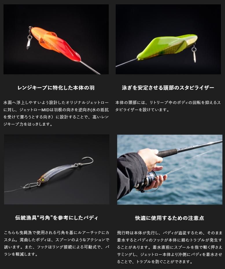 シラスサイズのマイクロプラグを遥か沖へ飛ばし、マイクロベイトパターンを攻略する『ジェットロー』の機構をベースに、本体の浮き上がりを抑えてレンジキープ力に特化させた中層狙いのモデル。ベイトはいるもののボイルがなく、トップウォーターへの反応も無いような状況に最適で、中層に沈んでいる魚へと直接アプローチすることが可能です。