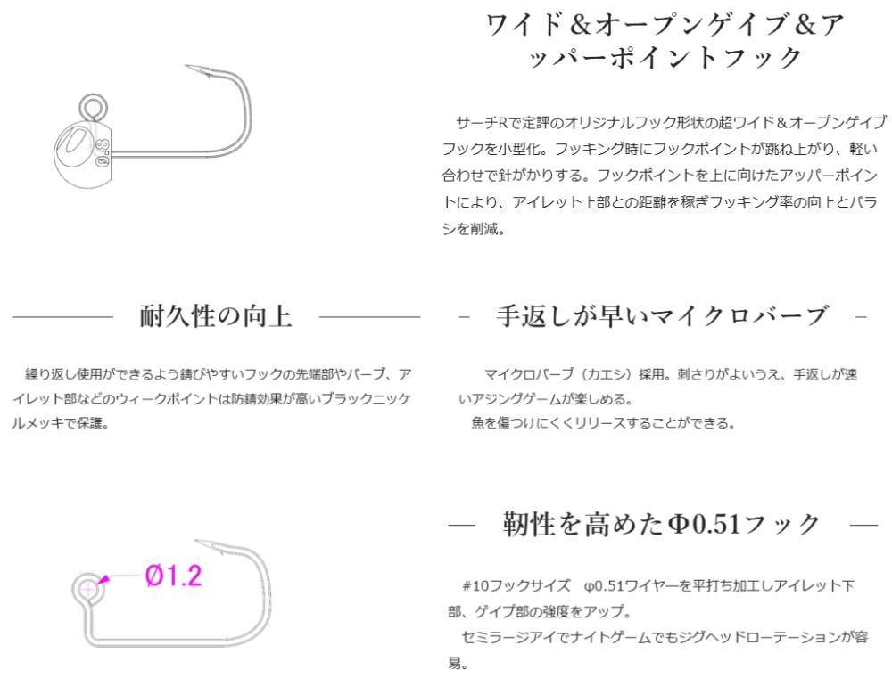 フック:材質/ハイカーボンスチール 表面処理/化学研磨、防錆ブラックニッケルメッキ 形状/オープン&ワイドゲイブ 平打ち、降伏応力/1.70kgw 引張強さ/1.85kgw 線径Φ0.51