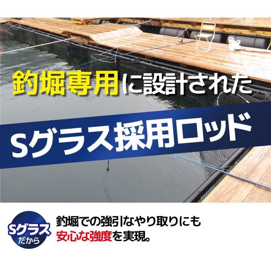 強引なやり取りが必要とされる海上釣堀において、強度と粘りに優れ、折れにくいSグラスを採用。抜群の強度を持ちつつ、1日中持っていても疲れない驚きの軽さを実現しています。使いやすさ重視の「300」や広範囲を探ることを目的とした「360」対象魚によって選べるようになっております。海上釣堀ゲームに自信を持ってお勧めする逸品です。