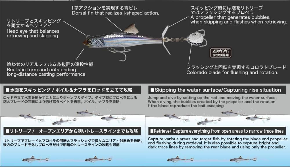 ただ巻きでプロペラ+ブレードのダブルフラッシングアクションでより広範囲のターゲットに力強くアピールします。