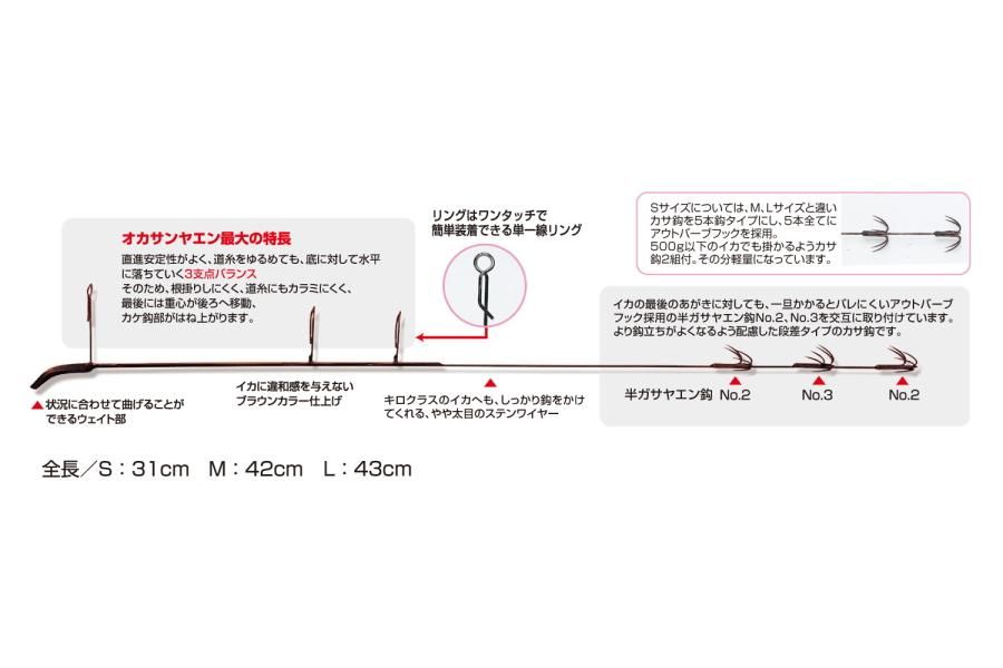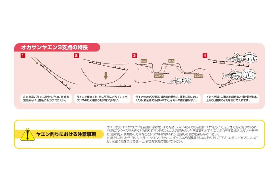 そのため単純に道糸をゆっくりと張る、緩めるの繰り返しでイカをしっかりキャッチしてくれるので、初心者にもおすすめのヤエンです。カサ鈎も掛かりの良さとバラシ解消を両立させたアウトバーブフック採用の半ガサヤエン鈎No.2、No.3を交互に装着しています。これで、釣果UP間違いなし。