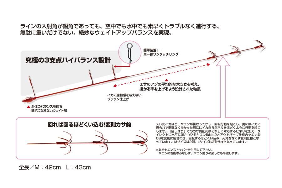 陸釣りでの捕獲率を上げるチューンを施した陸っぱり対応ヤエン。浅めのポイントがメインとなる陸釣り(堤防、地磯等)では足場が高くとも、ライン及びヤエンの入射角度が鋭角になることがほとんどの為、「オカサンヤエン」とはいえ進行を妨げられることも…。その状況を打開し、スムーズに進行、到達時には確実にイカの下に入り込むウェイトバランスを再検討、絶妙なバランスを備えています。スレイカに対応する独自のカサ鈎配列が特徴。