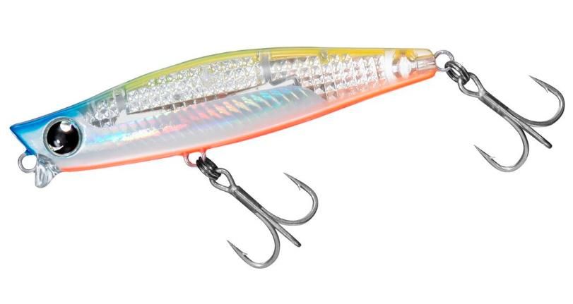 レーザーインパクトは、3Dマルチ反射構造により「イワシ」等と同様の高輝度反射光を多方向に放ち、「本物の誘いを遠くまで」を実現。更に、泳いでいる時の反射光の明滅まで再現。夜間や日陰のわずかな光でもベイトフィッシュと同様、昼夜・場所を問わず光でターゲットにアピール。揚力を生み出す独特な上ゾリ形状のヘッドと計算され尽くしたショートリップを携えたガルバ73Sは、着水直後から浮き上がりやすく、また横風時にラインを煽られても水面を滑ることなく水面直下をレンジキープして引いてくることのできる”リップ付きシンキングペンシル”。無数のプロトサンプルテストの末に、上へあがろうとする”揚力”と下へ潜ろうとする”レンジキープ力”といった相反する2つの効果を絶妙なバランスでマッチさせたことにより、水面直下というレンジをキープしながら安定したアクションで引いてくることが可能。73mmという小さなボディながら体高と厚みをもたせた形状は、最高のキャストフィールで狙ったところへ着水。頭から切り込むワイドなスイングアクションで表層を強く意識したシーバスにナチュラル且つ強烈にアピールしバイトを誘う。ロッドを立てて引いてくれば引き波を発生させることが可能で、ロッドを倒せば水面から数十センチといった水面直下のレンジを引いてくることも可能。