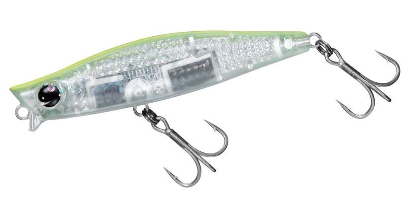 レーザーインパクトは、3Dマルチ反射構造により「イワシ」等と同様の高輝度反射光を多方向に放ち、「本物の誘いを遠くまで」を実現。更に、泳いでいる時の反射光の明滅まで再現。夜間や日陰のわずかな光でもベイトフィッシュと同様、昼夜・場所を問わず光でターゲットにアピール。揚力を生み出す独特な上ゾリ形状のヘッドと計算され尽くしたショートリップを携えたガルバ73Sは、着水直後から浮き上がりやすく、また横風時にラインを煽られても水面を滑ることなく水面直下をレンジキープして引いてくることのできる”リップ付きシンキングペンシル”。無数のプロトサンプルテストの末に、上へあがろうとする”揚力”と下へ潜ろうとする”レンジキープ力”といった相反する2つの効果を絶妙なバランスでマッチさせたことにより、水面直下というレンジをキープしながら安定したアクションで引いてくることが可能。73mmという小さなボディながら体高と厚みをもたせた形状は、最高のキャストフィールで狙ったところへ着水。頭から切り込むワイドなスイングアクションで表層を強く意識したシーバスにナチュラル且つ強烈にアピールしバイトを誘う。ロッドを立てて引いてくれば引き波を発生させることが可能で、ロッドを倒せば水面から数十センチといった水面直下のレンジを引いてくることも可能。