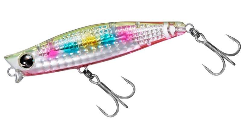 レーザーインパクトは、3Dマルチ反射構造により「イワシ」等と同様の高輝度反射光を多方向に放ち、「本物の誘いを遠くまで」を実現。更に、泳いでいる時の反射光の明滅まで再現。夜間や日陰のわずかな光でもベイトフィッシュと同様、昼夜・場所を問わず光でターゲットにアピール。揚力を生み出す独特な上ゾリ形状のヘッドと計算され尽くしたショートリップを携えたガルバ73Sは、着水直後から浮き上がりやすく、また横風時にラインを煽られても水面を滑ることなく水面直下をレンジキープして引いてくることのできる”リップ付きシンキングペンシル”。無数のプロトサンプルテストの末に、上へあがろうとする”揚力”と下へ潜ろうとする”レンジキープ力”といった相反する2つの効果を絶妙なバランスでマッチさせたことにより、水面直下というレンジをキープしながら安定したアクションで引いてくることが可能。73mmという小さなボディながら体高と厚みをもたせた形状は、最高のキャストフィールで狙ったところへ着水。頭から切り込むワイドなスイングアクションで表層を強く意識したシーバスにナチュラル且つ強烈にアピールしバイトを誘う。ロッドを立てて引いてくれば引き波を発生させることが可能で、ロッドを倒せば水面から数十センチといった水面直下のレンジを引いてくることも可能。