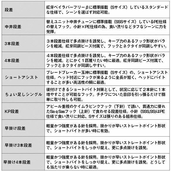 紅牙のタイラバに標準搭載されている紅牙フックSSシリーズを使用した、全ての紅牙シリーズに対応するタイラバ用替えフック。多くの真鯛をキャッチしてきた実績のあるフックを使用しているので、初心者から玄人まで安心して使用できる。