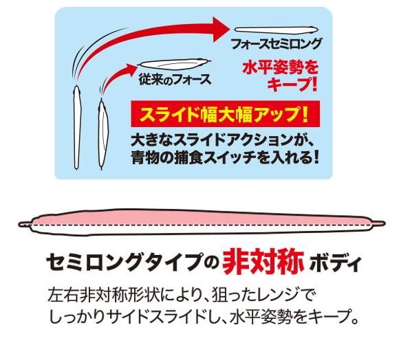 フォースセミロングは、「良く飛び・漂い・喰わせの姿勢」に特化したセミロングタイプのジグとなっている。