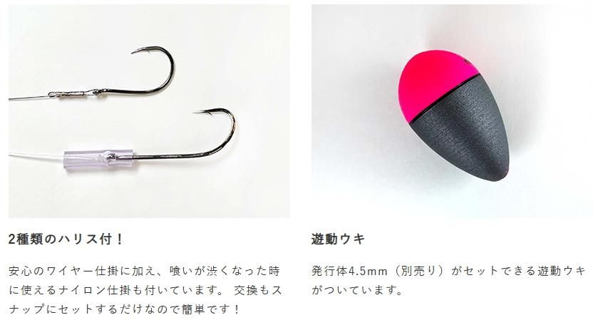 安心のワイヤー仕掛に加え、喰いが渋くなった時に使えるナイロン仕掛も付いています。 交換もスナップにセットするだけなので簡単です!
