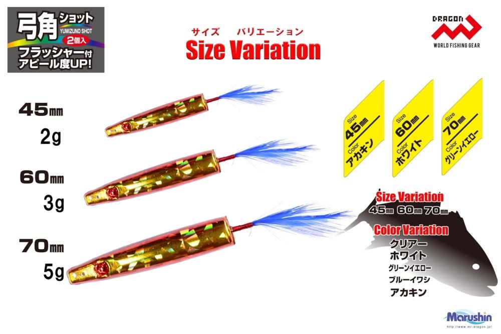 この弓角をDragonはサーフトローリングに最適と言われるサイズ、45mm・60mmと、中型回遊魚からやや大振りなサイズに対応する70mmを