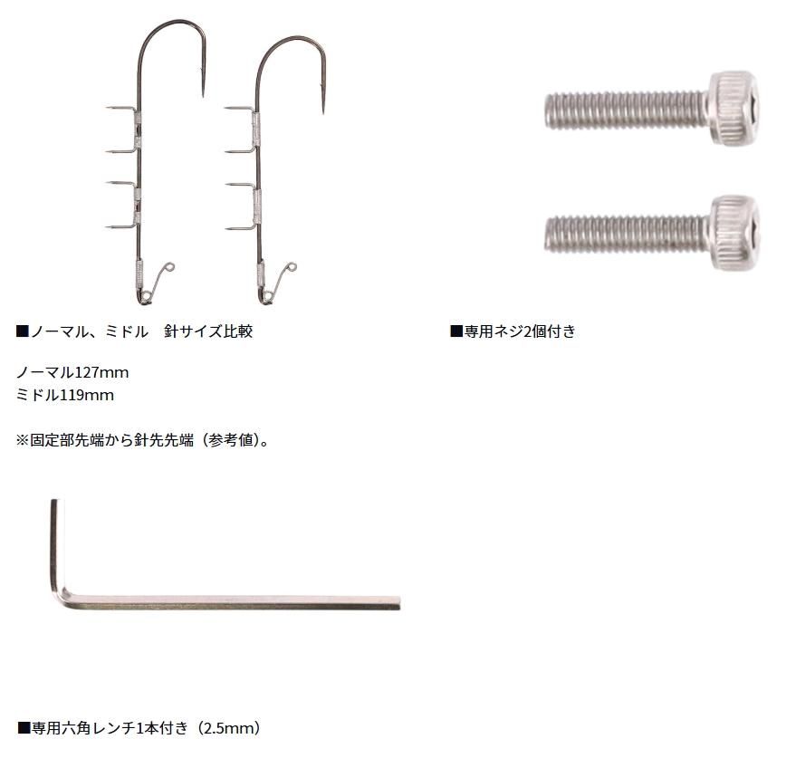 コンプリートタイプにセットされている針と同じサイズの針2個、ネジ2個、六角レンチ1本つき。