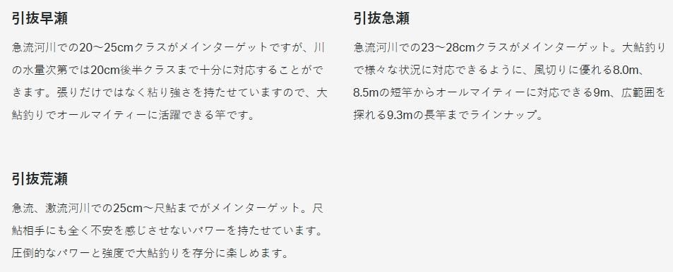 全国的に鮎の大型化が進む近年の河川傾向に完全対応するため、シリーズを通してブランクを肉厚化させています。超高弾性カーボンと強度に優れるカーボンを適材適所に配置することで、圧倒的なパワーと強度を実現。激流であろうと、巨鮎であろうと強度に不安を感じることなく、思いきり勝負を挑める竿に仕上がりました。負荷が掛かった状態で竿を立てた際や捻れによる竿先部の破損を防ぐため、強度に優れる「TORAYCA(R)M40X」を採用しています。魚に主導権を不意にとられ、竿角度が保てなくなった場合でも、負荷の掛かる竿元部付近も肉厚化させていますので、慌てることなく安心して対応することができます。継番毎にバランスを考慮しつつ肉厚化させることで、自重に対し持ち重りを感じにくい設計に仕上げています。基本調子は張りのあるパワーロッドですが、魚が掛かれば負荷に応じてしっかりと曲がり込みます。大鮎相手に思いきり友釣りを楽しみたい方に是非使っていただきたい一竿です。