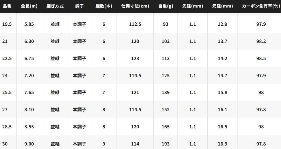 8から30までのワイドラインナップ。管理釣り場でも野釣り場でも、この「軽さ」があなたのへらぶな釣りをサポートする。