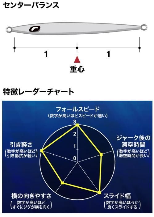 イージーぺブルはその名の通り、誰でも簡単に魅惑的なアクションを引き出せる高性能ジグ。スロー、ハイピッチともに対応し、速い潮流でも、ディープゾーンであっても、しっかり動いてターゲットを誘います。とくに注目したいのはフォールスピードの速さと引き抵抗の小ささ。ジャーク後はやや長めの滞空時間を生かしたロングスライドで魅せ、水平フォール、ショートローリング、スライドフォールなどの技ありフォールアクションでターゲットにアピールします。