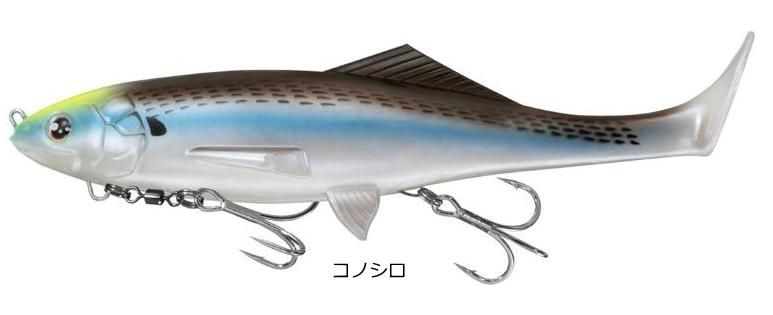 セイルアッパーはソフトエラストマー素材を採用しており、ハードルアーを見切ってしまうスレたシーバスでも反応させることができるフローティングスイムベイト。ソフト素材と逆付けテールはデッドスローリトリーブでもテールを振り子のようにしっかりと左右に振り、高い集魚効果を誇る。着水音に関してもハードルアーに比べナチュラルで、まるで魚がはねたような音であることからキャストを重ねてもスレにくいのが特徴。特に落ち鮎やコノシロなどのベイトについた大型シーバスを狙う際、ハードルアーとは違う引き出しとして是非ご使用いただきたい。