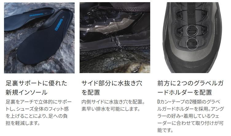 この1足がアングラーに提供するのは、快適さを維持したまま長く履き込める本物のタフネス。新型ラスト(足型)とBOA(R) Mシステムの組み合わせがフィット感を高め、表生地には高強度のマイクロファイバー1.8mmの合皮を選択。ミッドソールはラバー素材を採用しており、突き上げ感のない高いクッション性と長距離歩行でも疲れにくい履き心地を両立させている。もちろんソールはメンテ容易なジオロック。フィールドに応じて、あるいは摩耗具合によって簡単に交換可能だ。また、インナーソールはアーチを設けたオリジナル。足裏をサポートしつつシューズ内で踵が上がる状態をつくりだし、実釣中の負担を軽減する。