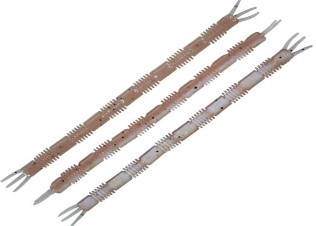 「リング系のワームは釣れる」「ストレートワームは根強く人気がある」そんな単純な発想から始まり、ストレートワームでありながらリング系リブの効果を重視した形状を考案。知り得る釣れるストレートワームの動きである、フォールによる揺れ、ジャーク時の震えが出るように長さや比重にこだわりました。最も汎用性が高いといえるストレートワームの釣れる要素をしっかりと詰め込みました。