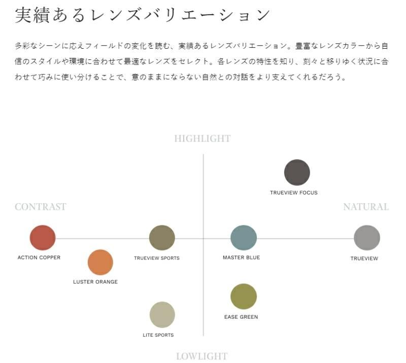 4カーブレンズ採用のフラットなフレームながら、多面にエッジを効かせて立体感を演出。ファッション性を高めると共に視界の広さを確保。JAKEと同様に軽量なフロントとの相性を考慮して採用されたβチタンテンプルは、バネ感のある軽やかな掛け心地。調整範囲の広い可動式チタン製クリングスパーツで、広い視界の大きなレンズでもまつ毛や頬への接触を防止。