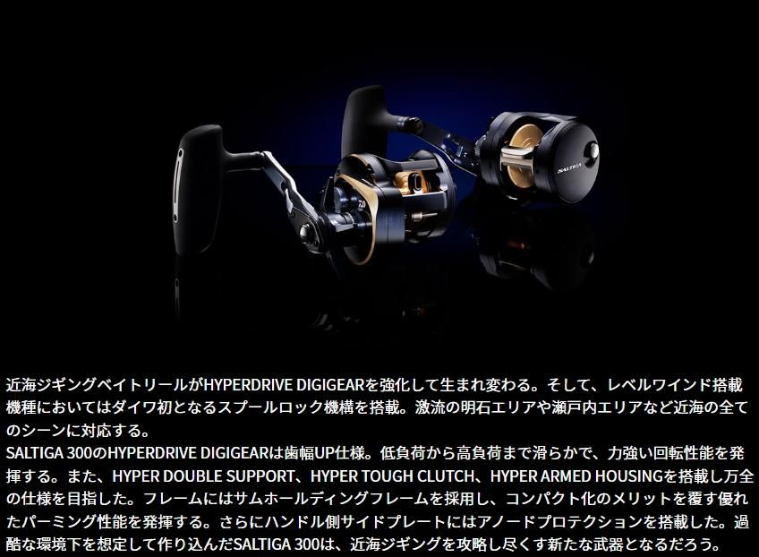 SALTIGA 300のHYPERDRIVE DIGIGEARは歯幅UP仕様。低負荷から高負荷まで滑らかで、力強い回転性能を発揮する。また、HYPER DOUBLE SUPPORT、HYPER TOUGH CLUTCH、HYPER ARMED HOUSINGを搭載し万全の仕様を目指した。フレームにはサムホールディングフレームを採用し、コンパクト化のメリットを覆す優れたパーミング性能を発揮する。さらにハンドル側サイドプレートにはアノードプロテクションを搭載した。過酷な環境下を想定して作り込んだSALTIGA 300は、近海ジギングを攻略し尽くす新たな武器となるだろう