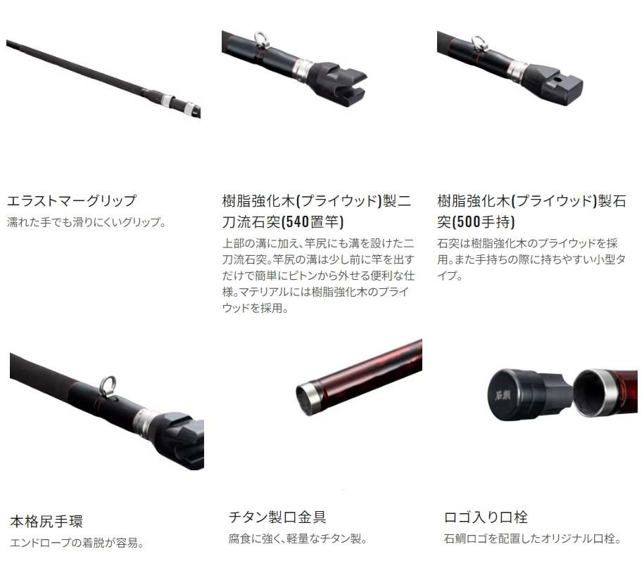 伝統の極翔 石鯛の特徴である、イシダイに違和感を抱かせない穂先・穂持ちの「喰い込み性能」に、ロッドのネジレ・つぶれを防ぐスパイラルXコア&ハイパワーXに加え、無駄のない筋肉質な高性能素材であるマッスルカーボンを搭載し、精度の高い仕掛けの投入から主導権を握られないパワーファイトまで、一連の動作を力強くサポートするブランクス性能が進化。細部には釣法ごとに拘り抜いた、ガイドサイズ・継ぎ方式・石突の選定により、操作性・感度・喰い込み性能の全てを向上。また、ガイドおよび口金具はチタン製を採用することにより軽快な振り調子を実現。全ての動作によどみを持たせず、一手ごとに精度を高め、ターゲットに近づくプロセスが明確に。次なるアプローチを切り開くロッドがここにある。