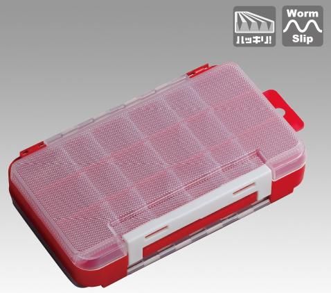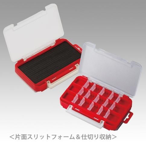 仕切りフォームの蓋内側に「ワームスリップ加工」を施しているので、ワームが蓋にくっつかなくなります。仕切りとスリットフォームのコンビタイプ“W-1”は最もランガンに適したケースと言えるでしょう。