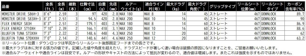 巨大なマグロ・GT・ヒラマサなどを攻略するために、それらビッグゲームの本質を深く追求し、数々の実績を積み上げながら導き出した3つのコンセプトを展開。MONSTER DRIVEは、飛距離・パワー・スピードの総合力を重視し、反発力を高めたシリーズで、遠征アングラー待望の3ピース設計。FLEX ENERGYは、安定した操作とファイトを重視し、曲げて獲るための粘り強さが特長のシリーズ。BLUEFIN TUNAは、200kgオーバーの巨大マグロを獲るためのOCEA最強ロッドシリーズ。ブランクスの基本構造には、曲げ・ネジレ・ツブレに対する高い強度を発揮するスパイラルXコアを、強化構造にはネジリ剛性をさらに高めてブレやダルさを抑制するハイパワーXを採用。さらに過酷なロッド角度に対応する高い耐久性も実現。各コンセプトの戦闘能力を磨き上げ、限界への挑戦をサポートします。