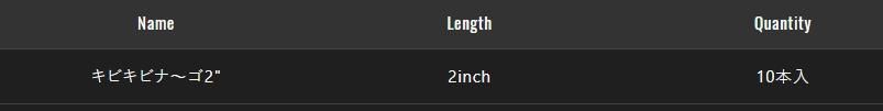 近年、アジングゲームやライトロックフィッシュゲームにおいて注目されつつある、ダート釣法に対応できるワームを目指し開発された゛キビキビナ〜ゴ2″。ボディ形状は水を切り裂く三角柱形状。テール部は、ダートアクションを妨げず、喰わせのステイ、リトリーブ時にナチュラルなアクションを生むクロステール形状に仕上げています。ラインアイが後方に位置するジグヘッドと組み合わせることで誘いのダートアクションを容易に演出可能です。アジやメバルなどの身近なターゲットから、メッキやカマス等のフィッシュイーターまでをも魅了する゛キビキビナ〜ゴ2″。ライトゲーム攻略の幅を広げるアイテムとなるでしょう。