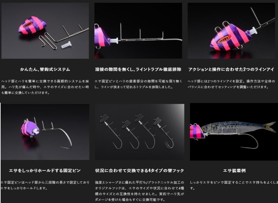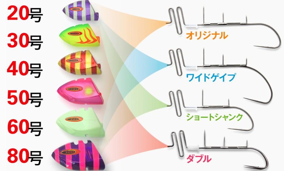 ヘッドの重さやカラー、フック形状を簡単に交換可能。さらに、20号から80号まですべての重さのヘッドに対し同じフックを装着できる設計。水深や潮の速さ、濁り具合や天気、さらには太刀魚の活性や狙うサイズ、餌のサイズと様々な状況の変化に瞬時に対応可能です。