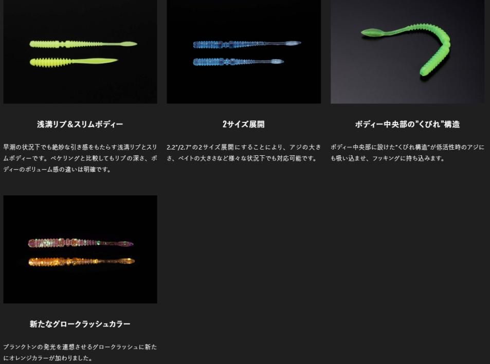 ボディー中間部にある”くびれ”によりワーム全体が折れ曲がりやすい設計になっています。同時にワームの硬度にもこだわり、吸い込みの弱い低活性時のアジにもフッキングに持ち込みます。