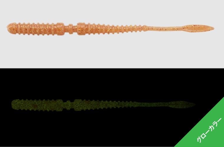 ボディー中間部にある”くびれ”によりワーム全体が折れ曲がりやすい設計になっています。同時にワームの硬度にもこだわり、吸い込みの弱い低活性時のアジにもフッキングに持ち込みます。