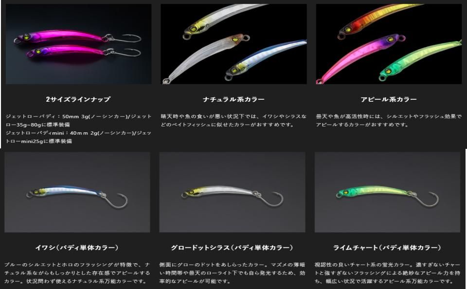 漁具である“弓角”をルアーとして進化させたジェットローバディ。スナップでの交換が可能で、カラーなどのローテーションが容易なうえ、貫通ワイヤー採用で青物の引きにも耐え得る高強度を実現。また、フックはスプリットリングで接続した可動式で、バラシを軽減するとともに、フックが劣化した際には交換が可能です。