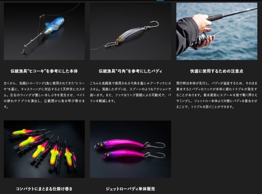 天秤形状をしたジェットロー本体が“飛ばし”とスプラッシュによる“寄せ”を担い、その後方を追うように泳ぐシラスサイズのバディ(喰わせルアー)にバイトさせるという仕組み。小型ルアーに足りない飛距離だけでなく、アピール力も補うことができます。