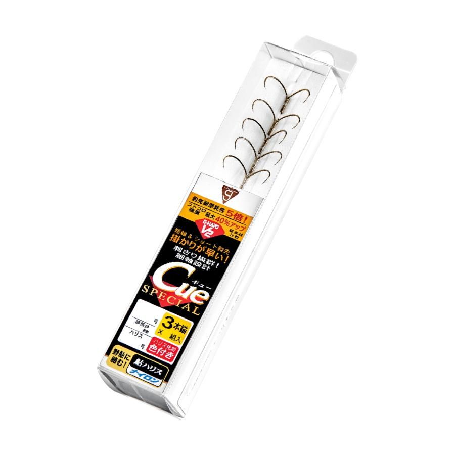 鈎先の短さは、フトコロの広さにつながり、鮎と接触する機会を増やす効果がある。軸の短さは、ハリスが鮎に触れると軸を中心に錨が素早く傾倒することで、瞬時に鈎先が鮎の身に触れやすくなる。もちろん、鈎先も軸も短ければいいというものではなく、長いものには長いものなりにメリットがあるのだが、現代の、あるいは近未来の鮎にベストマッチなCueの進化系が完成した。