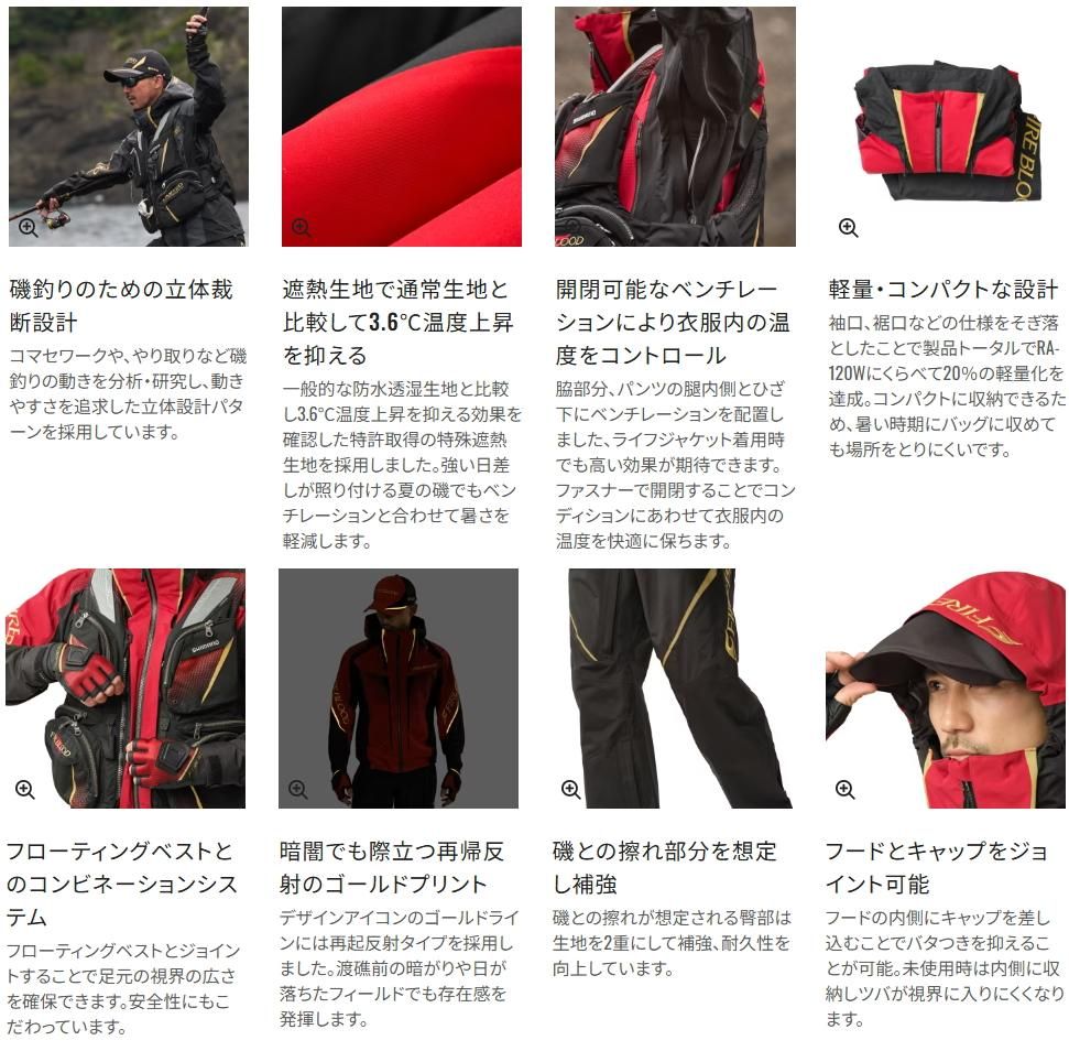 通常生地と比較して3.6℃温度上昇を抑える特殊遮熱生地を使用した、夏の磯を中心に活躍するレインスーツです。複数のベンチレーションで温度調整が可能なので日が昇ると暑く出船前や荒天時には寒いという春と秋の磯にも対応できる3シーズン設計です。磯釣り専用立体設計やフローティングベストとのコンビネーションシステムなど多くの機能を搭載しました。春〜秋に適したハイスペックな磯用レインスーツです。