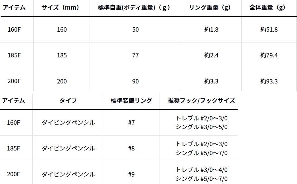 また、背面カウンターウエイトを搭載し、浮き上がりの姿勢にこだわり、水面が荒れていても同じ姿勢で浮き上がるように調整し、水面のコンディションを問わない水中へのダイブを可能とした。追求したアクションは立体螺旋S字アクションで、ボディ全体がワイドに動き、広範囲から魚を引き寄せる。