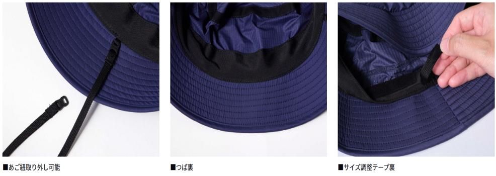より快適なバランスを保つために表面と裏面を異なる密度の生地での二層構造にして、風は通しにくく蒸れを逃しやすい。サイズはすべり裏のテープで調節可能。