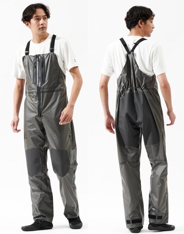 汚れや海水が付いても、水でさっと洗えば落ちやすい素材を開発。表側に防水層をもってくることで、水が生地に染み込まず、ドライで乾きやすい。PU,PVC等の船レインと比べ、透湿性があるため、衣服内が蒸れにくく、気温の高い時期でも快適に着用可能。船レインと比べ、シルエットをスリムにすることができ、動きやすい。擦れやすい膝部、尻部は二重に補強。フロントには上下から開閉できる止水ファスナーを採用。単体でも使用しやすいよう、胸ポケットを搭載。