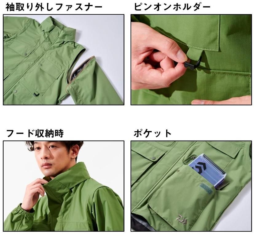 ジャケットにもフィッシングベストにもなる便利アイテム。生地はレイン素材を採用することでフードを被れば、小雨程度であれば防げます。暑くなった時には、袖を外し、フードを収納することでフィッシングベストとして着用可能。フロントには、ピンオンリールホルダー、背面にはタモ付けに便利なDカン付き。背面ベンチレーション付きで蒸れを逃がし、快適に着用可能。腰の大型ポケットにはルアーケースも入りやすいマチ付き仕様。