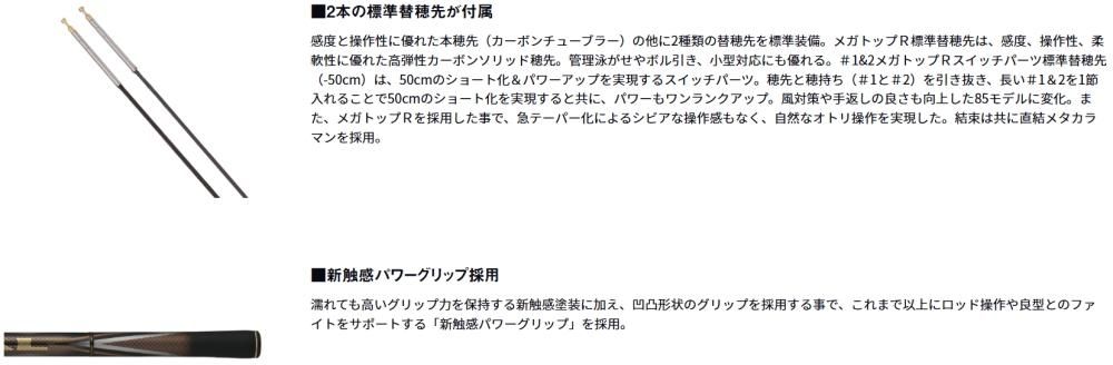 今作では22年に一新した「競技メガトルク」のDNAとテクノロジーを受け継ぎ、調子は元竿、元上を中心に更にパワーを持たせて、止めたい所で止めて、抜きたい所で引き抜ける調子にセッティング。またAIRシリーズ初搭載となる「V-JOINTα」を採用し、粘りとタメ性能が大幅に向上。
