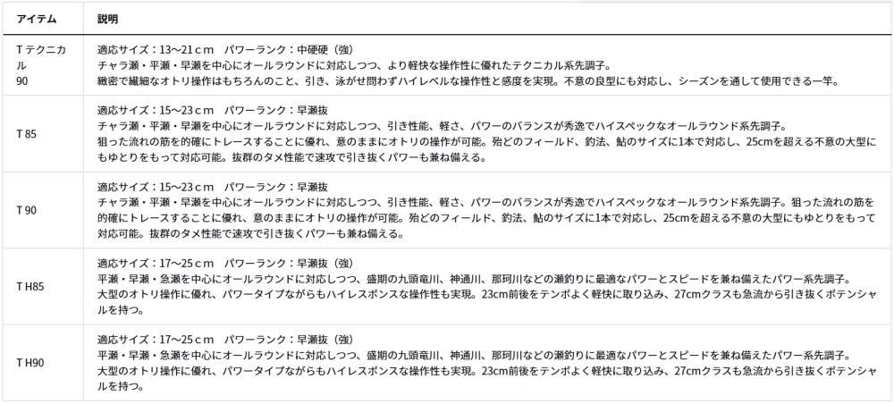銀影競技Tの調子をベースに、新たに「V-JOINTα」を採用することで、更に感度やタメ性能といった基本性能が向上。また、前作よりも先端部を細径化することで、優しくフィネスな操作感覚を実現。パワフルかつマイルドに、スピーディーかつハイレスポンスにフィールドを制する一竿に仕上がっている。