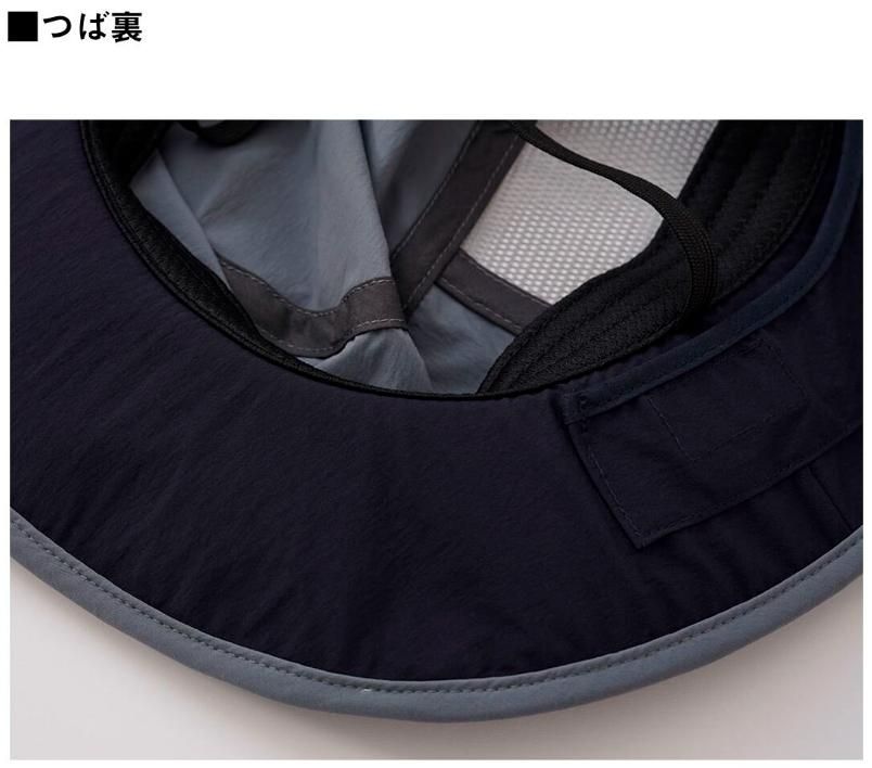 シェード部分には太陽からの熱が伝わりにくい遮熱生地を採用することで温度上昇を軽減。風で飛ばされにくいよう、顎ひも付き。ツバには形状記憶ワイヤー搭載。