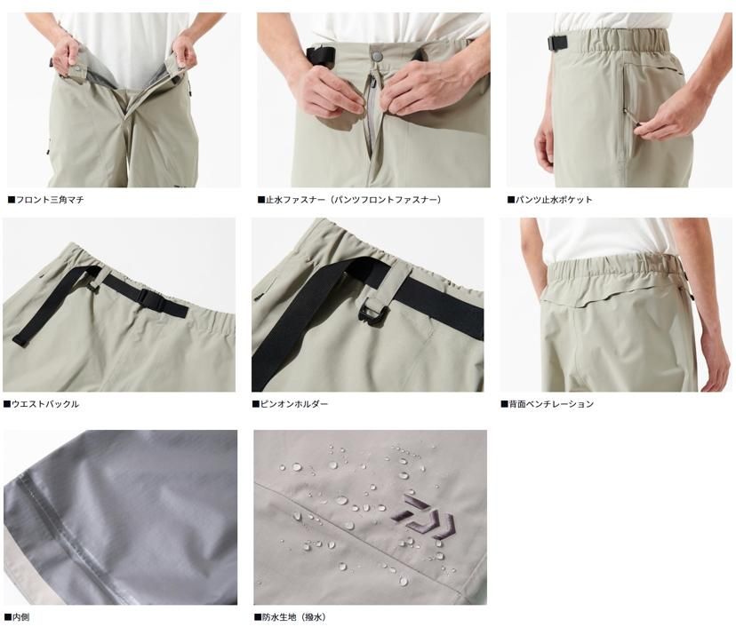 リップストップ生地のしっかりとした2.5層レイン生地を採用。裾からの水の吸い上げが起きにくい2.5層生地で、立ち込み時にも快適に着用可能。耐久撥水性能により透湿性能を保ちやすく、快適に着用可能。生地裏は肌離れしやすいよう凹凸のあるものを採用。パンツウエスト部はバックル付き調整ベルトでずり落ちにくく、動きやすい。マットな生地感で普段にも着やすいデザイン。腰裏のベンチレーションで蒸れを逃がし、暑い日にも快適に着用可能。