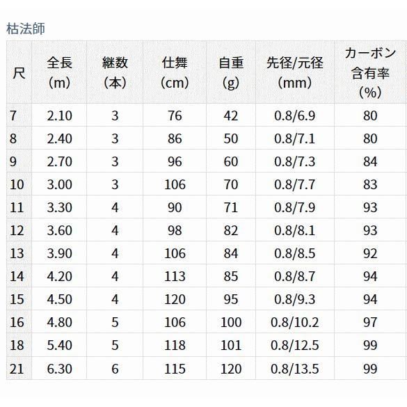 12尺はソリッド穂先と細身化により、より和竿のようなへらぶなとのやり取りを可能としつつ、握りを短尺よりも若干太く、竿尻の絞りを抑えることで負担なくへらぶなとのやり取りを楽しめる。また13尺は従来より軽くしなやかにバランスが見直されている。それに伴い12尺とは1尺違いながら穂先を先径0.8mmのチューブラー穂先とすることで枯法師らしい使い心地と操作性を両立させるこだわり。手間を惜しまず、仕様を変えながらも枯法師らしさを吟味した釣り味を提供する。